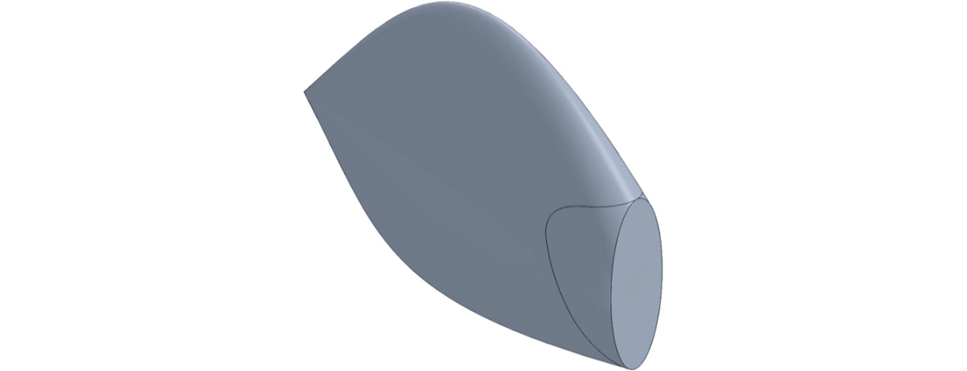 1.1.2 大黄鱼尾鳍模型的建立 基于大黄鱼尾鳍的腹部和背部轮廓线,利用Solidworks 2022软件中绘制样条曲线的方法绘制大黄鱼尾鳍的腹部和背部轮廓,建立大黄鱼尾鳍平面模型,利用放样操作,以大黄鱼尾鳍平面模型为引导线,建立大黄鱼尾鳍三维模型(图3)。大黄鱼尾鳍三维模型的具体参数为尾鳍x方向最大长度为62.4 mm,y方向最大高度为31.2 mm,z方向最大厚度为7.63 mm。蒙皮材料采用FLUENT中的流固耦合材料更改器进行更改,其中PE、PC、ST材料的杨氏模量分别为5E8、2.32E9、2E11 Pa,其泊松比分别为0.42、0.30、0.39。