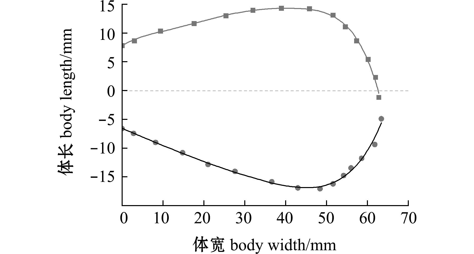 式中:yup为大黄鱼尾鳍背部轮廓线体宽方向的坐标;x为大黄鱼体长方向的坐标;ydown为大黄鱼尾鳍腹部轮廓线体宽方向的坐标。