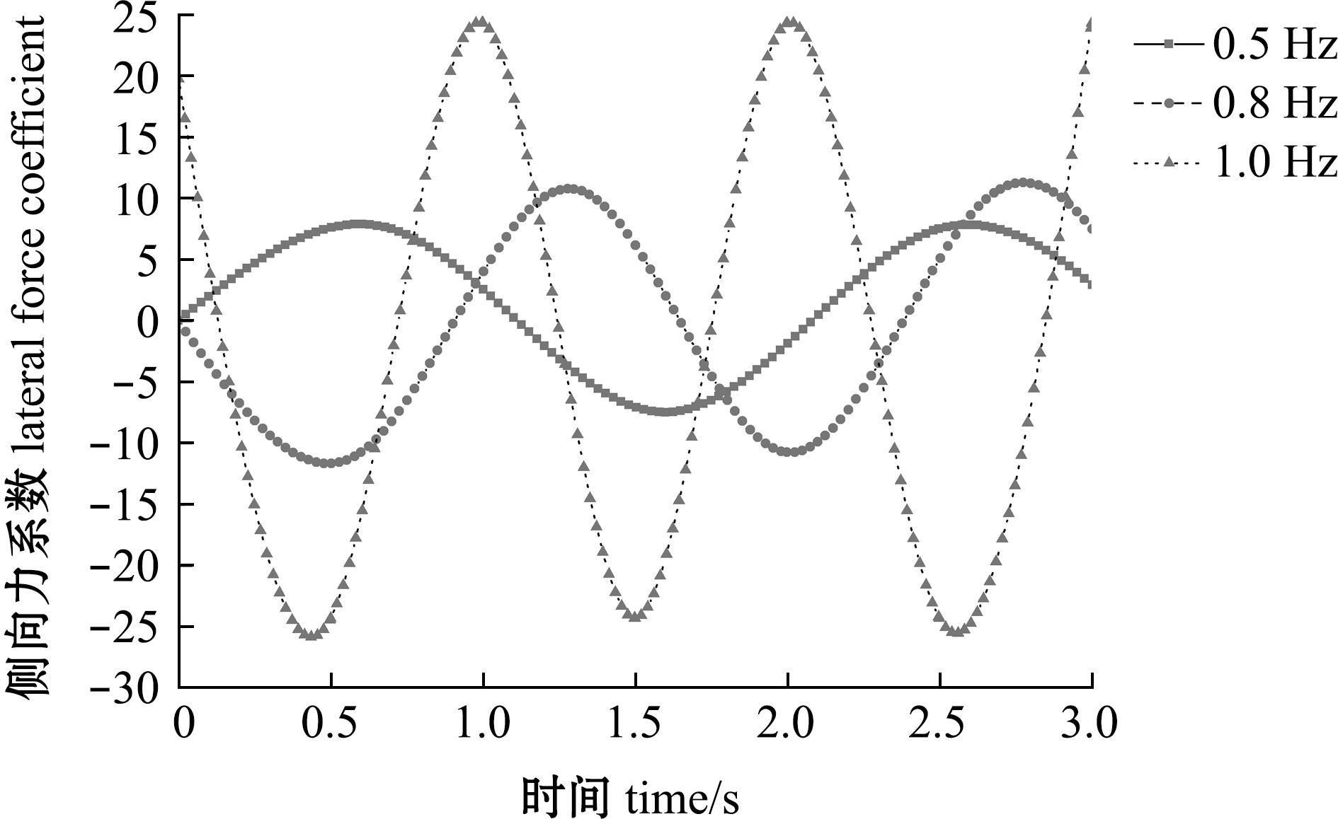 不同运动频率的大黄鱼尾鳍模型的侧向力也呈现出一种正运动频率的效应,即随着运动频率的增加,大黄鱼尾鳍的侧向力也随之增加(图9)。在水流速度为0.5 m/s时,摆角幅度为30°条件下,运动频率为0.5 Hz时大黄鱼尾鳍模型的侧向力系数范围为-7.497 03~7.828 19;运动频率为0.8 Hz时大黄鱼尾鳍模型的侧向力系数范围为-10.759 3~11.289 98;运动频率为1.0 Hz时大黄鱼尾鳍模型的侧向力力系数范围为-25.533 51~24.327 77。