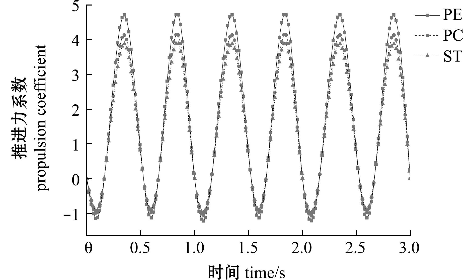 不同材料的大黄鱼尾鳍在推进力上呈现出PE材料优于PC材料优于ST材料的现象(图12)。在水流速度为0.5 m/s时,运动频率为1.0 Hz,摆角幅度为30°条件下变厚度PE材料大黄鱼尾鳍模型的推进力系数范围为-1.133 88~4.716 67;变厚度PC材料大黄鱼尾鳍模型的推进力系数范围为-0.975 66~4.140 82;变厚度ST材料大黄鱼尾鳍模型的推进力系数范围为-0.898 81~3.886 92。