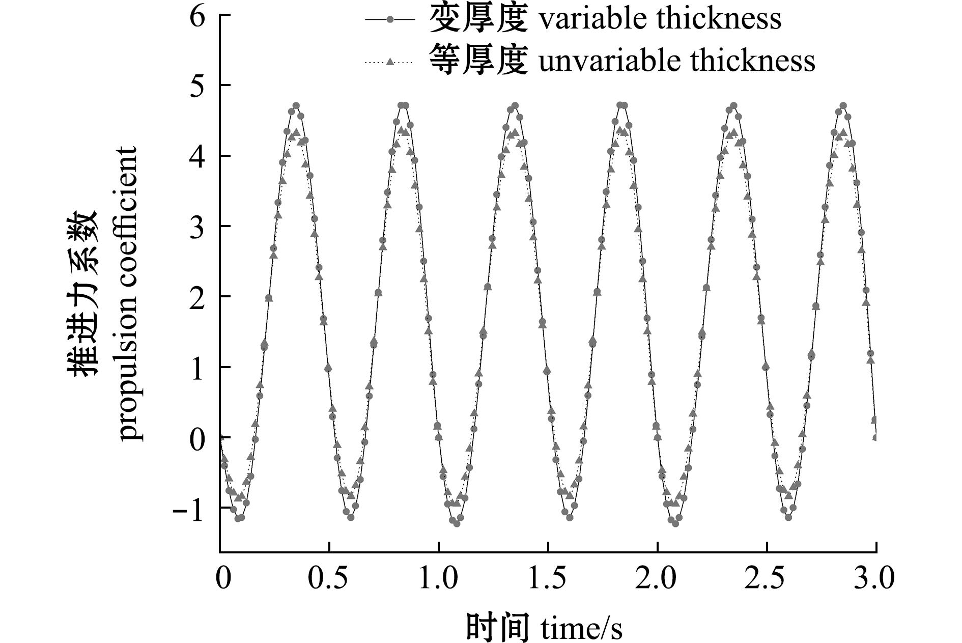 3)不同厚度的尾鳍模型在水动力上体现出变厚度尾鳍优于等厚度尾鳍的现象,即变厚度尾鳍相较于等厚度尾鳍,具有更好的推进性能,符合真实鱼类尾鳍结构特征。