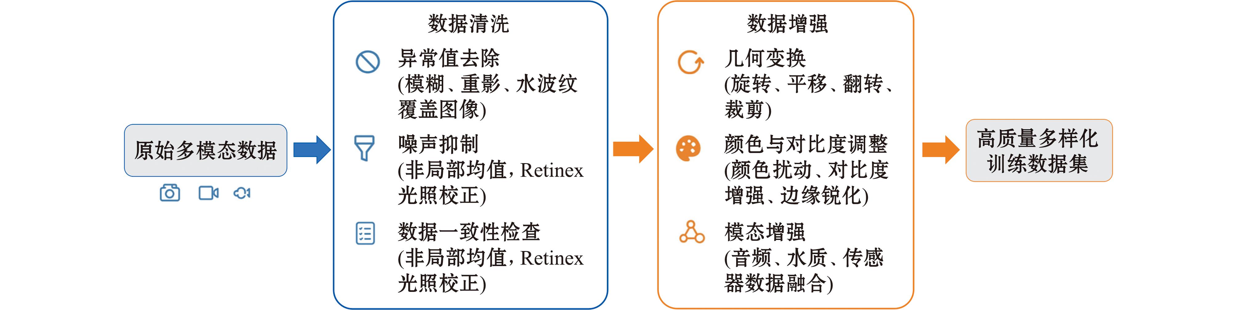清洗与增强是连接采集与建模之间的桥梁环节,其任务不仅是“剔除干扰”,更重要的是“重塑样本分布”,提升数据集对实际场景的适应性与泛化能力。雷俊等[39]基于CycleGAN[40]构建了用于对虾养殖图像的图像增强模型,通过合成弱光、浑浊等极端场景图像,有效提升了模型在非理想环境下的鲁棒性;毕甜甜等[41]采用N-Gram和多模型融合的方法对水产养殖长文本进行建模,通过字词之间的相互语义关联关系及联合建模实现了对实体语义更加完善的识别;陈辉等[42]综述了水下图像降噪技术在鱼类图像处理中的应用,包括非局部均值滤波与Retinex光照校正[43]等方法,为鱼类图像预处理提供了系统方案。目前,清洗环节还广泛应用图像评分模型对模糊、重影、水纹覆盖等图像进行自动剔除,此外,采用数据增强技术提升样本多样性,可使模型更具鲁棒性和迁移能力[44]。