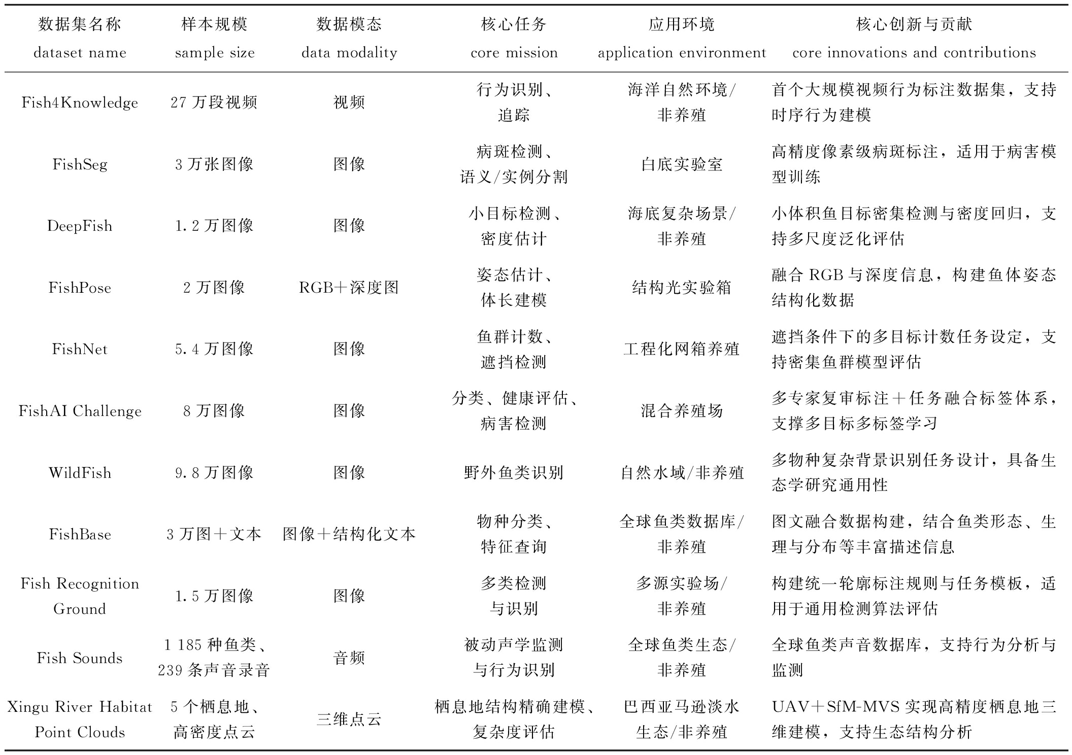 养殖鱼类是全球水产品供给的主要来源,目前全球一半的食用鱼类来自养殖业[1]。随着信息技术与人工智能的飞速发展,水产养殖业正逐步从依赖经验、以机械化为特征的传统模式迈向自动化乃至智能化的新阶段。在此转型过程中,高质量数据集的构建成为数智渔业发展的核心基础与关键驱动力。养殖鱼类数据集是指经过系统采集、标注或结构化处理,能够反映养殖鱼类个体或群体状态及其所处环境的多源、多模态数据的集合,其在实际应用中支撑以下几类关键场景:通过图像与视频数据识别鱼类表观异常、行为异常,实现早期病害诊断与预警;基于视频分析鱼类摄食强度、群体聚集程度,结合环境数据动态调整投喂策略,提升饲料利用率;利用三维点云与图像数据测量鱼体长度、鱼体质量,结合历史数据预测生长趋势,优化出栏时间等。高质量数据集与人工智能的结合,可以进一步发挥数据和人工智能的倍增效应[2]。