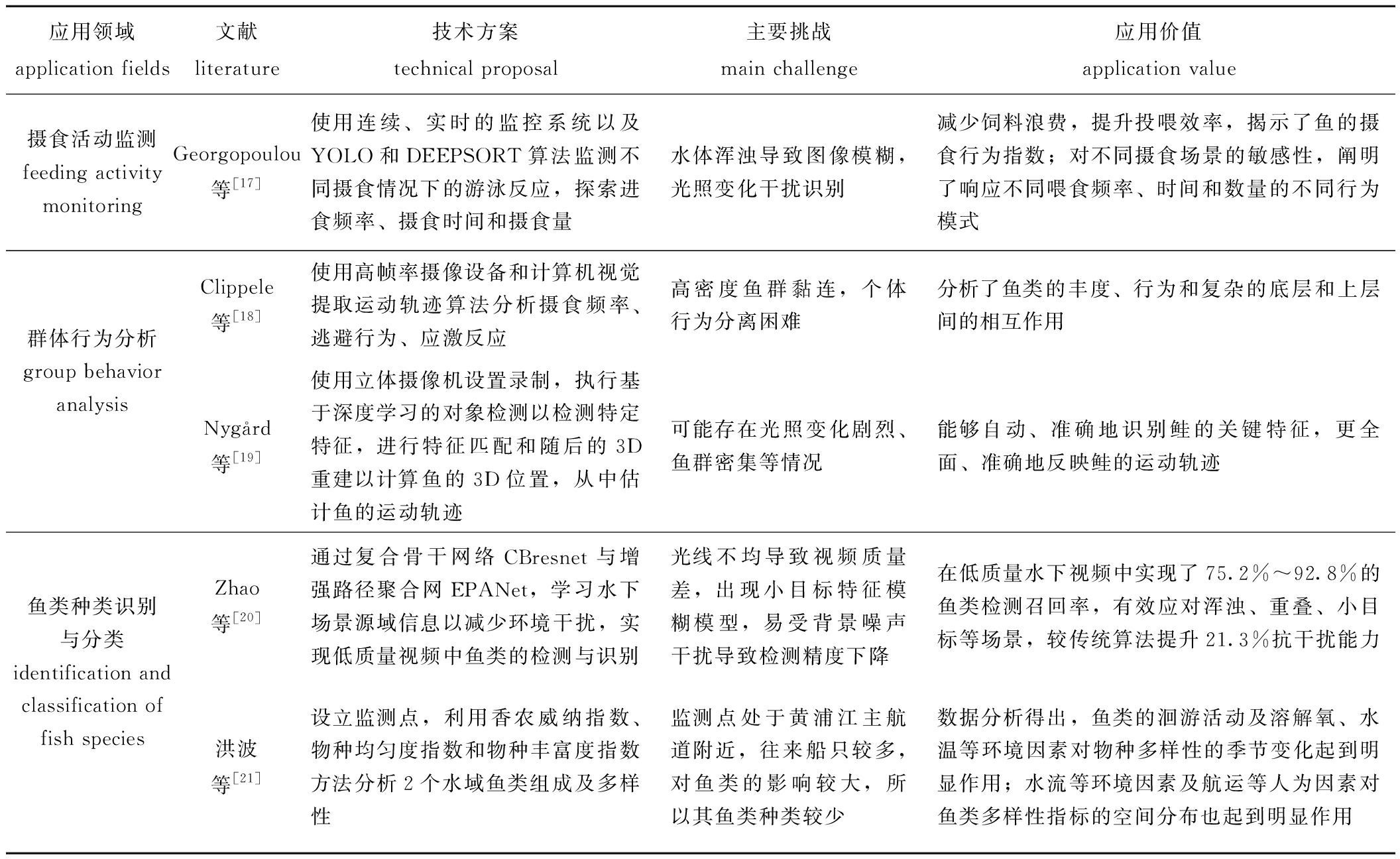 视频数据在养殖鱼类领域的重要性体现在其对动态信息的捕捉能力与时间维度的研究价值。在摄食活动监测中,计算机视觉技术实时分析鱼群聚集程度、个体抢食动作活跃度及水面残饵量,可为智能投喂系统提供依据,实现按需投喂,减少饲料浪费,优化饲料转化率,并通过摄食积极性变化及时发现潜在健康问题[16]。群体行为分析可评估鱼类福利和应激水平。鱼类种类识别与分类技术在水下视频中日益重要,对混养池塘管理、鱼苗分选、特定物种研究及防止逃逸物种扩散至关重要,通过识别不同鱼种独特形态特征、纹理模式及行为差异,实现复杂水下环境中自动分类和个体计数,提升管理效率和精准度。表1为视频数据的具体应用。