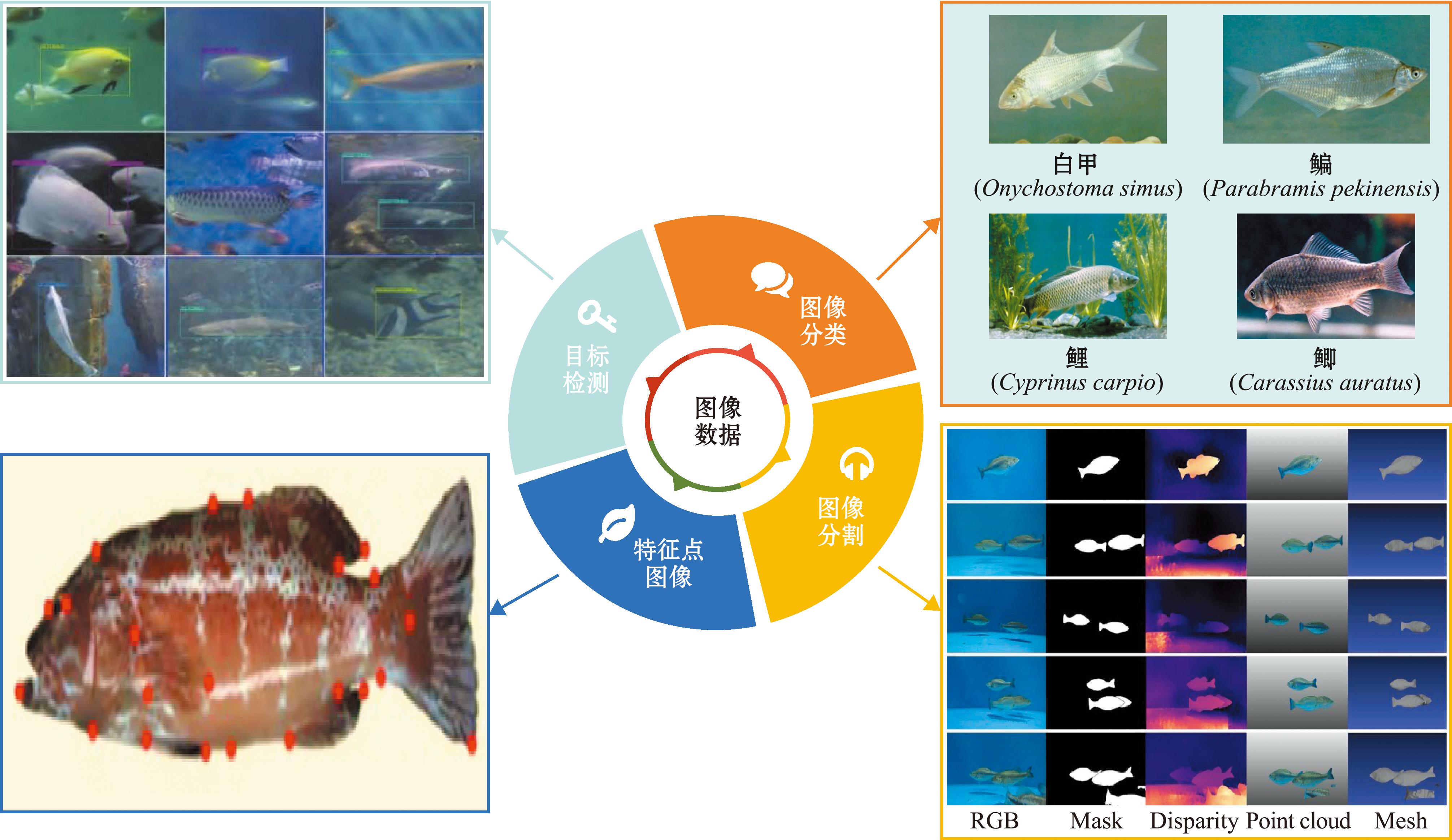 图像数据(图1)是构建养殖鱼类数据集的核心数据类型,通过捕获鱼类表观特征的视觉信息,为精准化、智能化养殖管理提供关键依据。鱼类图像数据集在多个领域至关重要:记录鱼类体型、颜色、鳞片纹理等外观特征,为物种分类和新物种发现提供可视化依据;借助机器学习算法训练图像识别模型,实现鱼类物种自动化分类,提升渔业资源调查效率。Wu等[11]提供了大口黑鲈鱼苗图像的数据集,该数据集专为密集场景中的小目标检测而设计,使用LabelImg工具进行注释,并转换为COCO格式,可以应用于各种场景,包括育苗、鱼苗零售和生存评估;Francescangeli等[12]利用OBSEA平台产生的沿海鱼类时间序列图像数据集,通过对其中鱼类标签进行分析,有助于研究鱼类种群动态。