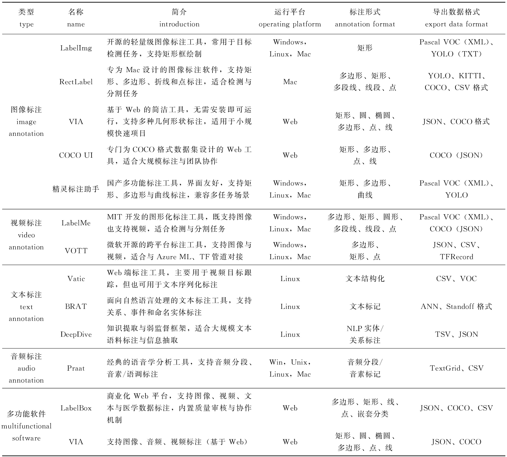 为了进一步保障标注质量,部分平台引入“标注一致性打分”机制,利用不同标注员对同一图像的重标差异度分析一致性,并通过投票机制确定最终标签。同时,通过半监督学习模型对未标注图像进行伪标注,能够大幅减少人工成本,提升样本利用率。归纳来看,标注阶段的控制重点在于“高精度+高一致性”,这样能充分利用自动化工具和专家反馈相结合的机制,有效减少主观误差并提升标签标准化水平。在选择数据标注工具时(表2),需要考虑标注对象、标注需求和不同的数据集格式[49]。