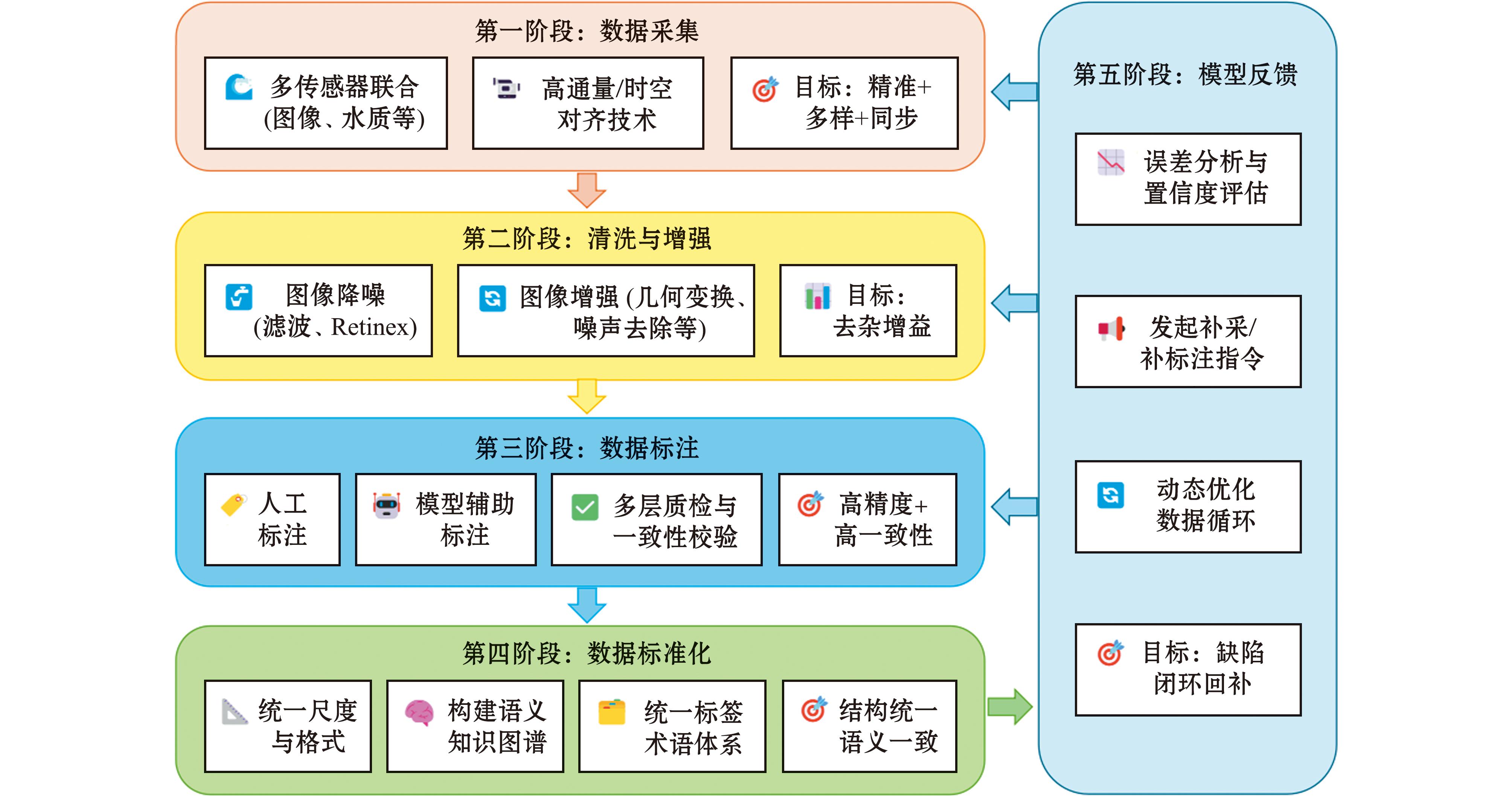 在养殖鱼类数据集构建过程中,数据质量直接决定了人工智能模型的性能边界、系统部署的稳定性及其产业化落地能力。尤其是在多模态[34]、高密度、动态化的水产养殖场景中,数据易受采集误差、标注偏差、格式混乱和标签不一致等问题影响,构建一套科学、高效、可闭环的数据质量控制与标准化机制已成为行业共识。图5所示的流程图展示了一种“采集-清洗增强-标注-标准化-反馈优化”的闭环式数据管理路径。在该流程中,各环节通过技术手段、工具系统及专家参与协同联动,以实现鱼类数据集的多维度质量保障。