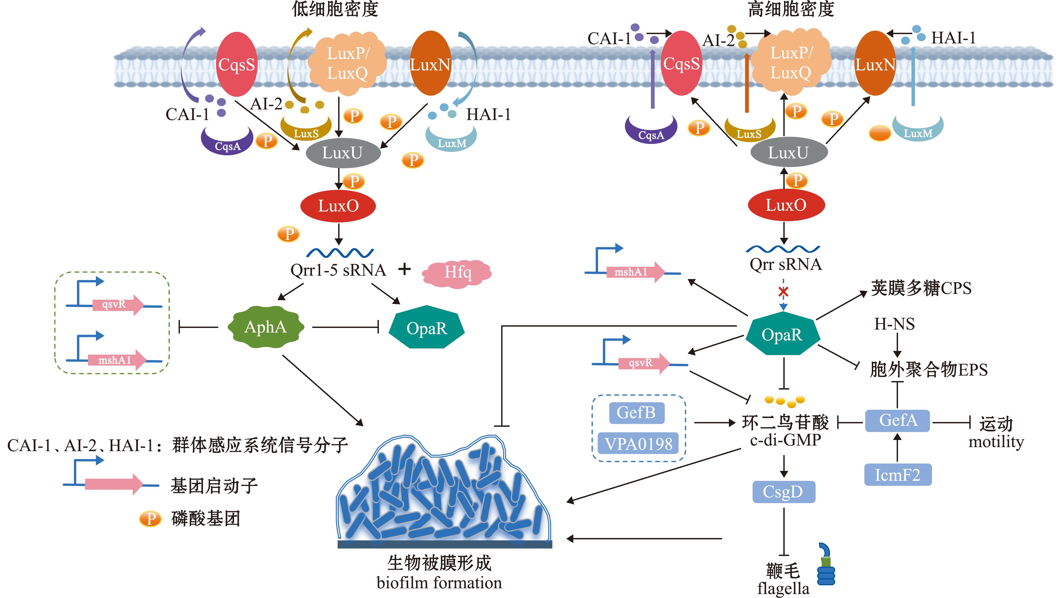 1)群体感应。群体感应是一种细胞密度依赖的细菌通讯机制,广泛存在于细菌中,用于精确调控基因表达和群体行为。细菌通过感知自诱导剂(autoinducers,AIs)的浓度变化,响应环境信号,从而调节基因表达,优化其生长、定植、感染及生物被膜形成等生理过程[8-9]。弧菌QS系统中LuxR及其同源物包括副溶血弧菌中的OpaR、哈维氏弧菌中的LuxR、霍乱弧菌中的HapR及创伤弧菌中的SmcR,其可通过结合其靶基因启动子并激活生物被膜相关基因的转录来调控生物被膜形成及细菌群体行为[10]。其中,LuxR和AphA是QS系统的核心转录因子,二者通过动态平衡低细胞密度(low cell density,LCD)和高细胞密度(high cell density,HCD)下的基因表达,协同调控多种QS相关基因[10-11]。
