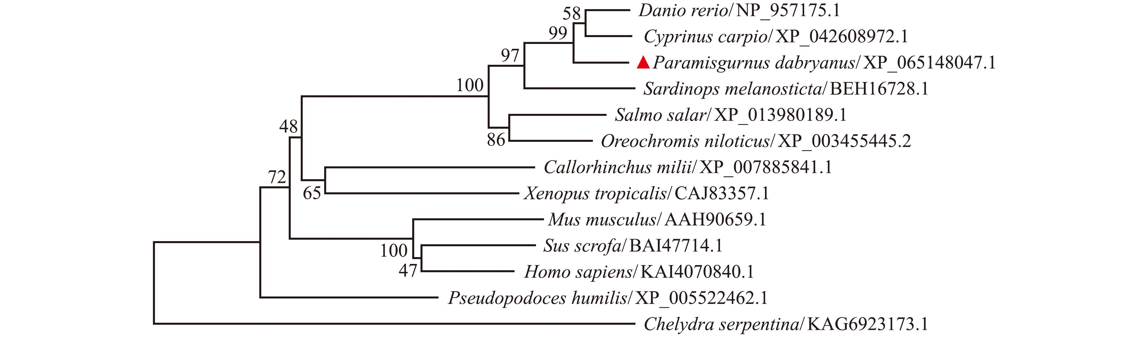大鳞副泥鳅(Paramisgurnus dabryanus)是一种淡水杂食性鱼类,是中国的重要经济养殖品种之一,近年来市场需求逐渐增加[15-16]。该物种生长具有性别二态性,相同日龄的雌鱼体质量通常大于雄性。其性别决定方式为雌性异配的ZZ-ZW类型[17],同时还受温度的影响[18],在温度升高时,雄性占比就会显著升高[19-20]。这些性别决定的特征使得大鳞副泥鳅性别分化发育研究广受关注。目前,关于大鳞副泥鳅性别相关研究主要集中在cyp19a[21]、sox家族[22-24]和dmrt1[23]等经典的性别决定基因研究中,hsd17b12a与大鳞副泥鳅性腺发育是否有关联尚无报道。本实验室前期转录组学研究中发现,hsd17b12a基因在大鳞副泥鳅的雌雄性腺中存在显著的差异表达[25],暗示着该基因在大鳞副泥鳅的性别决定中可能发挥着重要作用。因此,本试验中以大鳞副泥鳅为试验对象,基于其参考基因组[20]所注释的hsd17b12a基因全长CDS和蛋白质序列,进行了蛋白质预测与进化分析;并采用实时荧光定量PCR技术(qRT-PCR)测定了大鳞副泥鳅胚胎、不同发育时期的性腺,以及成鱼不同组织中hsd17b12a的表达模式,以期为该基因在大鳞副泥鳅生长发育与性腺分化中的重要作用提供科学参考。