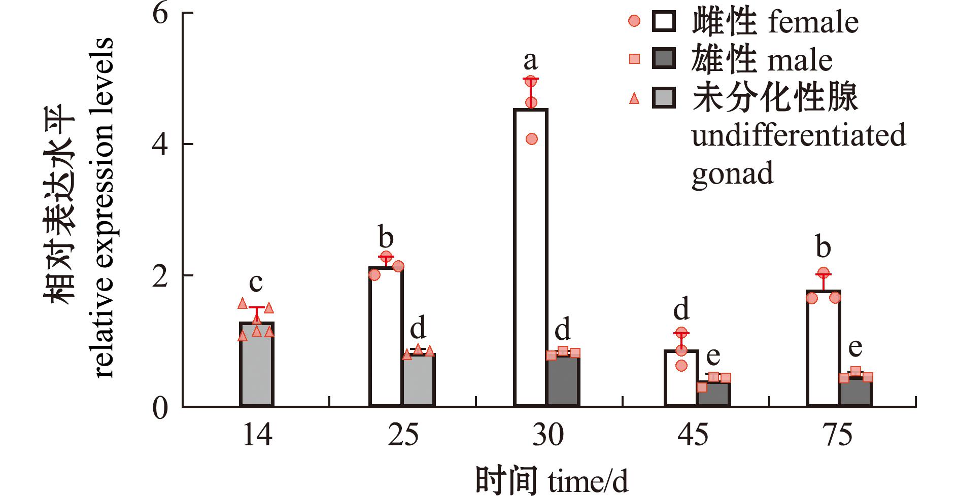 在雌雄性腺未分化时(14 d),随机抽取了6组(每组5尾)鱼进行检测,各组hsd17b12a基因的表达量差异很小(图8),表达水平基本相同。但随着性腺的发育,该基因在性腺出现两性分化与发育成熟过程中呈现出了完全不同的变化趋势。hsd17b12a基因的表达在卵巢分化初期开始上调(25 d),在30 d时的表达水平最高,远高于所有其他节点,在卵巢分化完全时(45 d)回落至表达量最低点,在性腺分化完全时(75 d)又上调至接近分化初期的水平。其表达变化与卵巢发育的时间点相吻合,表明该基因在卵巢的分化发育中发挥着重要作用。
