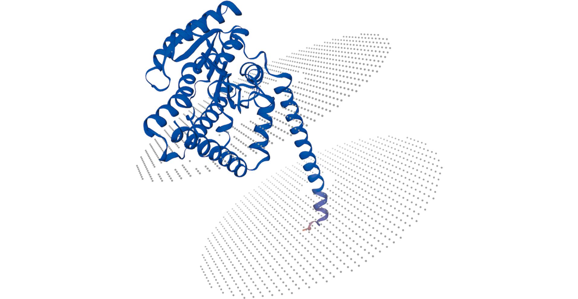 蓝色螺旋为蛋白质的α-螺旋,代表该蛋白三级结构的空间结构;灰色点阵区域代表蛋白质的表面或潜在互作区域。