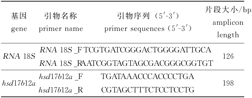 基因 gene 引物名称 primername 引物序列 (5'-3') primersequences(5'-3') 片段大小/bp amplicon length RNA18S RNA18S_FTCGTGATCGGGACTGGGGATTGCA 126 RNA18S_RAATCGGTAGTAGCGACGGGCGGTGT hsd17b12a hsd17b12a_F TGATAAACCCACCCCTGA 198 hsd17b12a_R CGTAGCTTTCTCCTCCTG