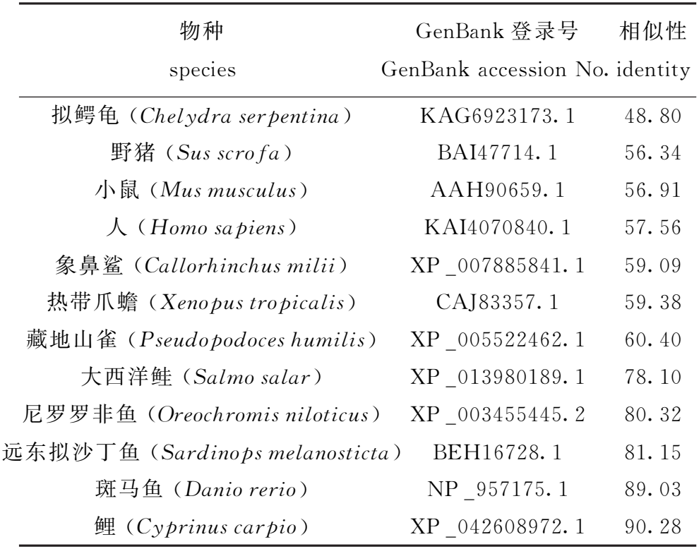 物种 species GenBank登录号 GenBankaccessionNo. 相似性 identity 拟鳄龟 (Chelydraserpentina) KAG6923173.1 48.80 野猪 (Susscrofa) BAI47714.1 56.34 小鼠 (Musmusculus) AAH90659.1 56.91 人 (Homosapiens) KAI4070840.1 57.56 象鼻鲨 (Callorhinchusmilii) XP_007885841.1 59.09 热带爪蟾 (Xenopustropicalis) CAJ83357.1 59.38 藏地山雀 (Pseudopodoceshumilis) XP_005522462.1 60.40 大西洋鲑 (Salmosalar) XP_013980189.1 78.10 尼罗罗非鱼 (Oreochromisniloticus) XP_003455445.2 80.32 远东拟沙丁鱼 (Sardinopsmelanosticta) BEH16728.1 81.15 斑马鱼 (Daniorerio) NP_957175.1 89.03 鲤 (Cyprinuscarpio) XP_042608972.1 90.28