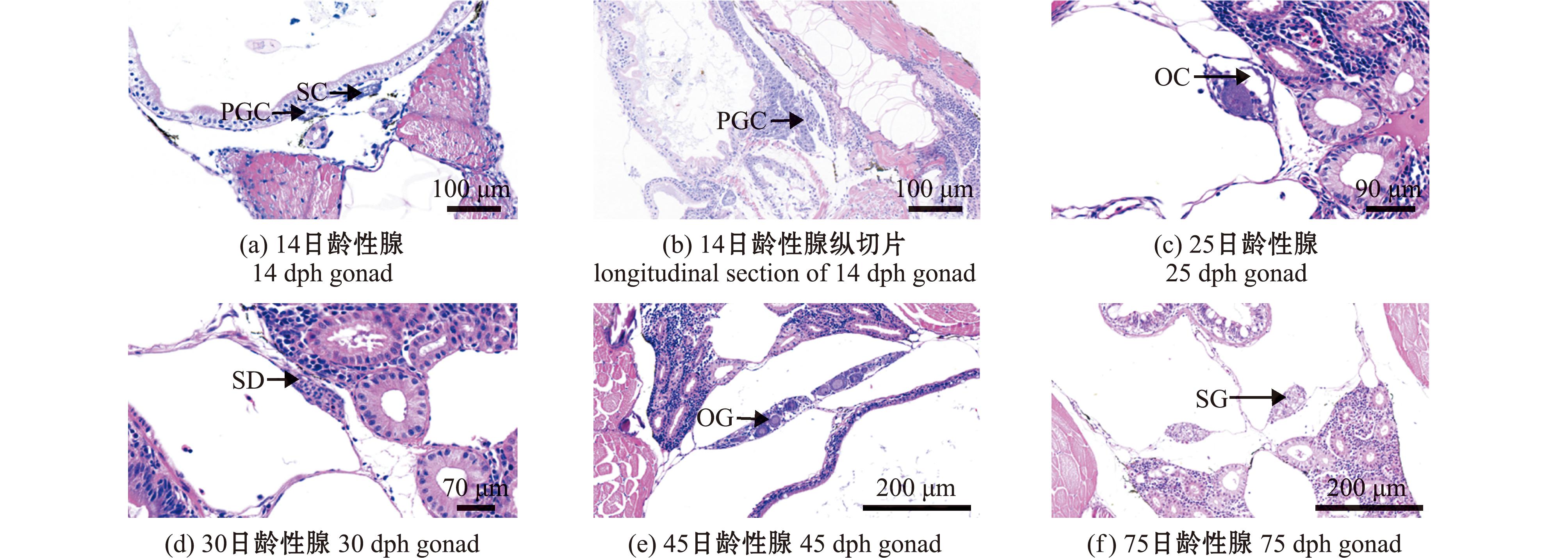 2.3.1 性腺组织学观察 在14~75 d期间每天取大鳞副泥鳅性腺进行HE染色切片,观察发育情况以确定性腺的关键发育阶段(图5)。大鳞副泥鳅14 d时性腺尚未成熟,但鱼体体腔切片中已可观察到原始生殖细胞(图5(a)、(b));25 d时卵巢开始发育,切片可观察到卵巢腔(图5(c));30 d时精巢开始发育,可观察到输精管(图5(d));45 d时卵巢发育完成,可观察到卵原细胞(图5(e));75 d时精巢发育完成,可观察到精原细胞(图5(f))。