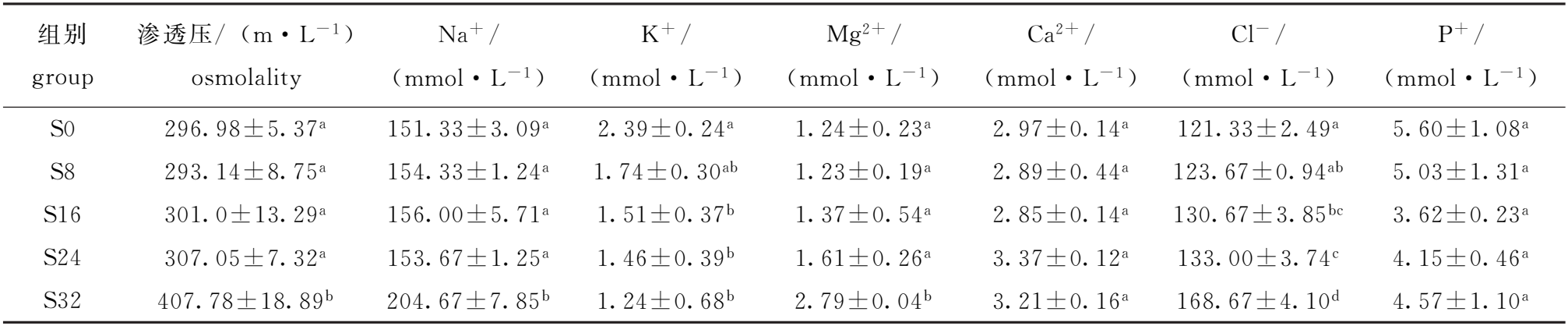 组别 group 渗透压/ (m·L-1) osmolality Na+/ (mmol·L-1) K+/ (mmol·L-1) Mg2+/ (mmol·L-1) Ca2+/ (mmol·L-1) Cl-/ (mmol·L-1) P+/ (mmol·L-1) S0 296.98±5.37a 151.33±3.09a 2.39±0.24a 1.24±0.23a 2.97±0.14a 121.33±2.49a 5.60±1.08a S8 293.14±8.75a 154.33±1.24a 1.74±0.30ab 1.23±0.19a 2.89±0.44a 123.67±0.94ab 5.03±1.31a S16 301.0±13.29a 156.00±5.71a 1.51±0.37b 1.37±0.54a 2.85±0.14a 130.67±3.85bc 3.62±0.23a S24 307.05±7.32a 153.67±1.25a 1.46±0.39b 1.61±0.26a 3.37±0.12a 133.00±3.74c 4.15±0.46a S32 407.78±18.89b 204.67±7.85b 1.24±0.68b 2.79±0.04b 3.21±0.16a 168.67±4.10d 4.57±1.10a