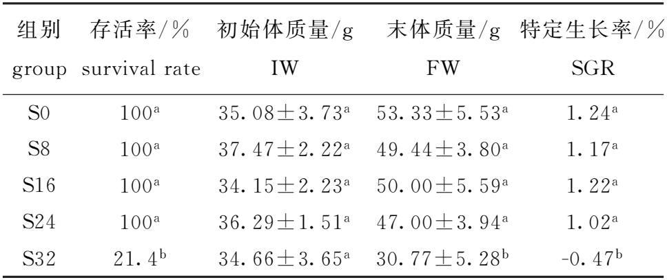 组别 group 存活率/% survivalrate 初始体质量/g IW 末体质量/g FW 特定生长率/% SGR S0 100a 35.08±3.73a 53.33±5.53a 1.24a S8 100a 37.47±2.22a 49.44±3.80a 1.17a S16 100a 34.15±2.23a 50.00±5.59a 1.22a S24 100a 36.29±1.51a 47.00±3.94a 1.02a S32 21.4b 34.66±3.65a 30.77±5.28b -0.47b