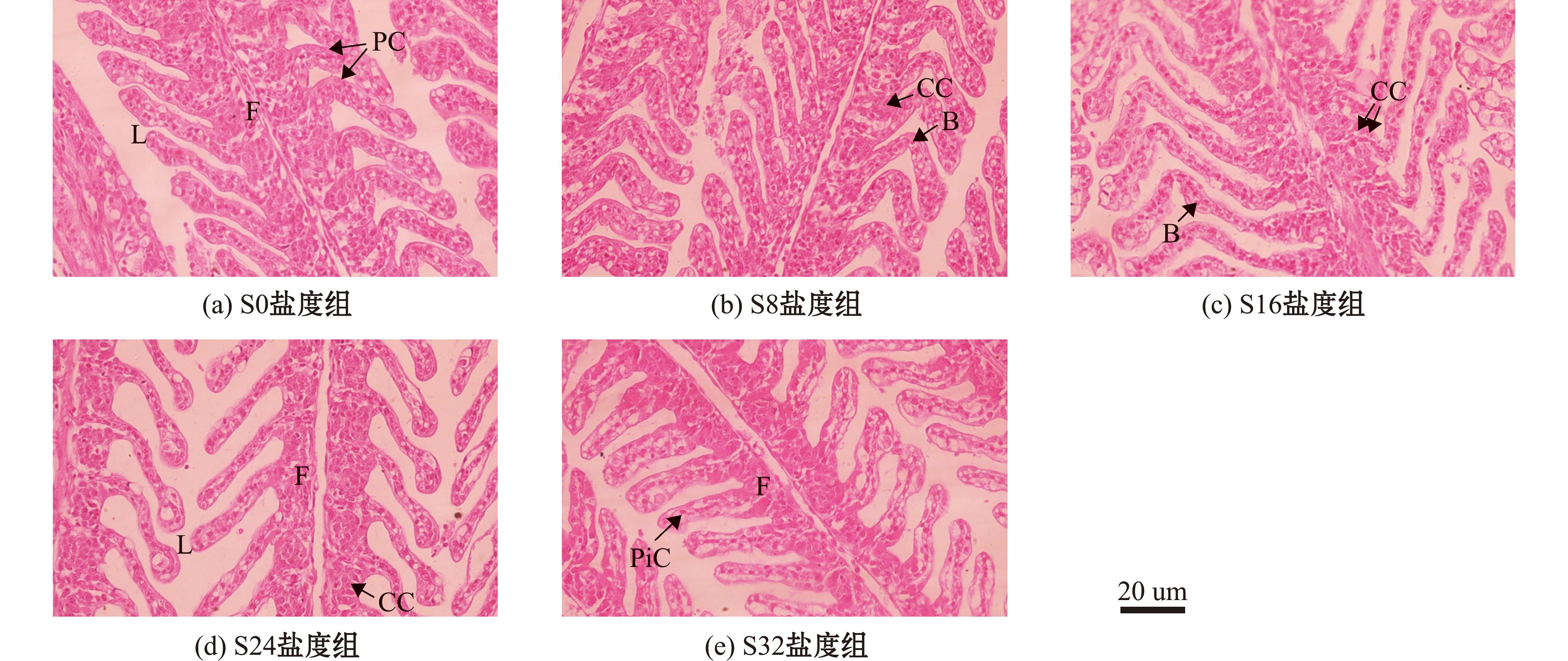 鳃是鱼类体内的一种多功能器官,除进行气体交换和含氮废物的排泄外,它还参与维持无机盐离子和酸碱平衡的调节。生活在不同盐度水体中的鱼类其鳃组织结构具有较大差异,如广盐性硬骨鱼通过调节鳃丝上皮中泌氯细胞的结构和数量来适应水体的盐度变化[24]。因此,当鱼类处于极端环境中时,鳃组织结构常被广泛用于研究。泌氯细胞主要位于鳃丝上皮内,少量分布于鳃小片上。当环境中离子平衡发生变化,鱼体鳃上皮细胞的形态、分布、数量及内部结构均会发生明显的适应性改变,以维持体内的渗透压平衡[25]。本研究中发现,随着环境盐度逐渐增加,试验鱼泌氯细胞和上皮细胞呈现出不同程度空泡化,其中盐度32下鳃丝细胞空泡化最为严重(图1),这与Shirangi等[26]对波斯鲟(Acipenser persicus)的研究结果类似,表明盐度32时是乌苏里白鲑的生理不耐受状态。