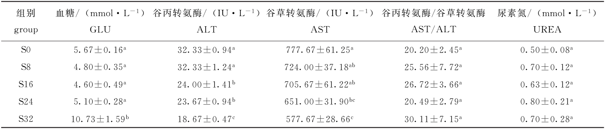 组别 group 血糖/ (mmol·L-1) GLU 谷丙转氨酶/ (IU·L-1) ALT 谷草转氨酶/ (IU·L-1) AST 谷丙转氨酶/谷草转氨酶 AST/ALT 尿素氮/ (mmol·L-1) UREA S0 5.67±0.16a 32.33±0.94a 777.67±61.25a 20.20±2.45a 0.50±0.08a S8 4.80±0.35a 32.33±1.24a 724.00±37.18ab 25.56±7.72a 0.70±0.12a S16 4.60±0.49a 24.00±1.41b 705.67±61.22ab 26.72±3.66a 0.63±0.12a S24 5.10±0.28a 23.67±0.94b 651.00±31.90bc 20.49±2.79a 0.80±0.21a S32 10.73±1.59b 18.67±0.47c 577.67±28.66c 30.11±7.15a 0.70±0.28a