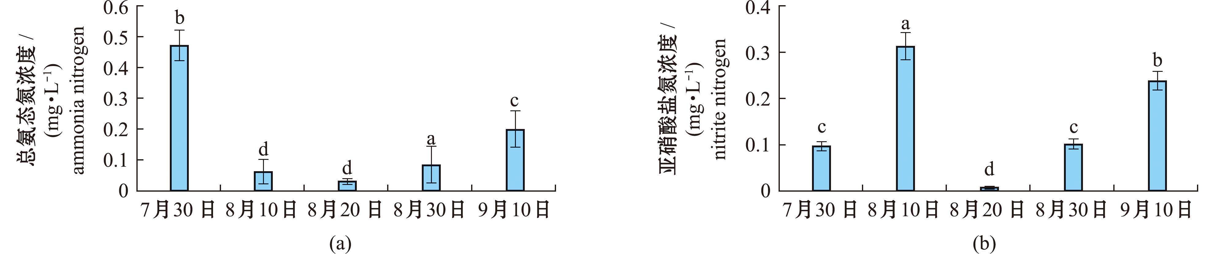图6为蛤仔中间育成池塘水中总氨氮和亚硝酸盐氮浓度变化。从图6(a)可见,水中总氨态氮浓度在7月30日达到0.470 mg/L,8月10日时降低至0.061 mg/L,8月20日水中总氨态氮浓度仅为0.029 mg/L,之后逐渐升高,至9月10日时为0.198 mg/L。图6(b)为水中亚硝酸态氮浓度变化,在7月30日时为0.097 mg/L,在8月10日达到0.310 mg/L,8月20日降至0.010 mg/L,后逐渐升高至9月10日时的0.238 mg/L。