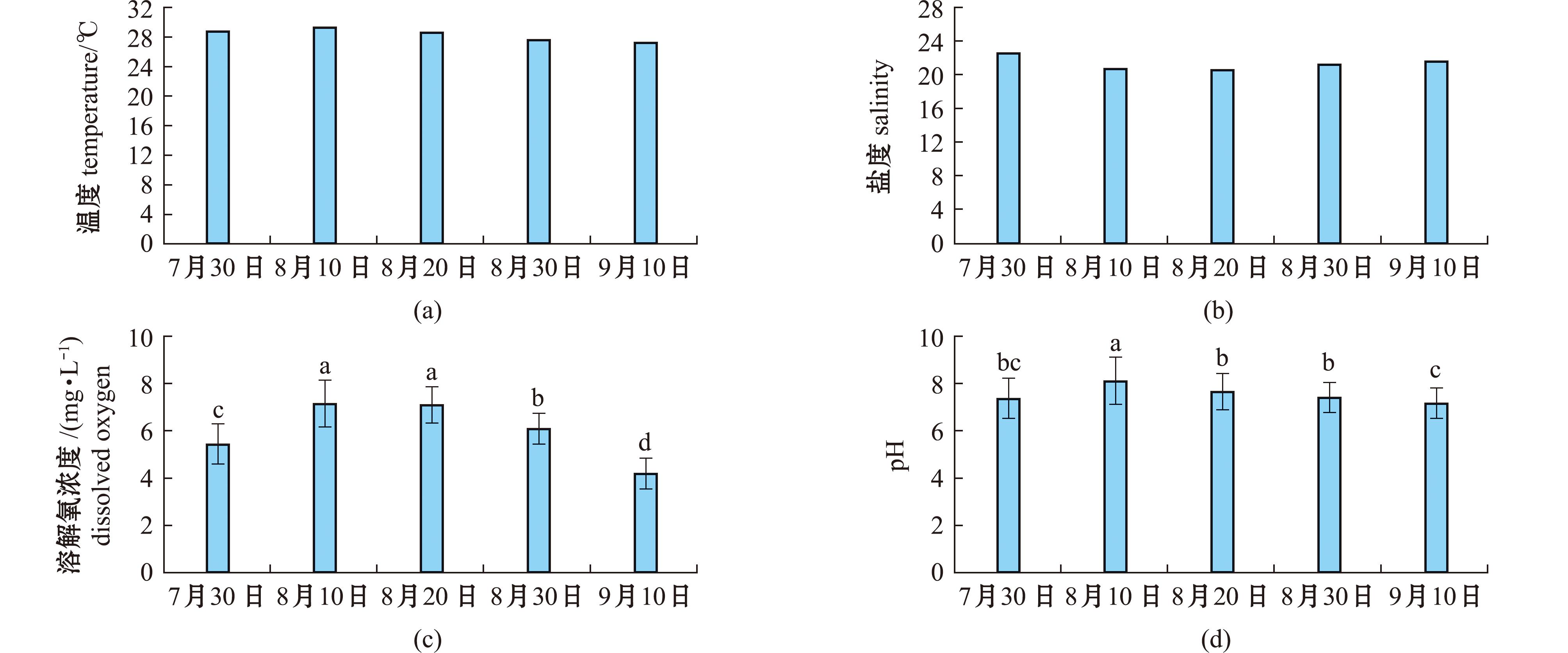 在对北方蛤仔中间育成池塘的夏季现场测定中,所获取的水温、盐度、溶解氧及pH的结果如图5所示。具体而言,图5(a)呈现了池塘水温的动态变化情况。2023年7月30日—9月10日,池塘水温波动范围为27.3 ℃~29.6 ℃。在整个试验期间,水温最高值出现于8月10日,此后,随着蛤仔中间育成时间的持续进行,水温值呈逐渐降低态势。图5(b)为中间育成池塘水体的盐度情况,其数值为20.6~24.4。其中,盐度最高值出现于7月30日,而最低值则出现在8月10日。图5(c)为水中溶解氧浓度变化,范围为 4.72~7.13 mg/L。溶解氧浓度的最高值同样出现在8月10日,随后伴随蛤仔中间育成时间的延长而逐渐降低,至9月10日达到溶解氧浓度的最低值。图5(d)为水的pH变化情况,其变化趋势与水中溶解氧浓度的变化趋势一致,pH的波动范围为7.16~8.11。
