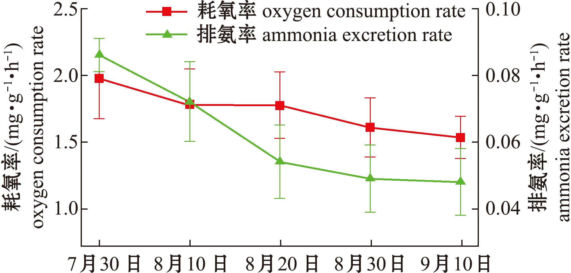 图4为夏季池塘中间育成蛤仔在不同生长阶段的耗氧率与排氨率变化情况。从图4可见,随着蛤仔中间培育时间的增加,蛤仔稚贝每小时、单位干质量的耗氧率和排氨率总体均呈下降趋势。对于耗氧率的变化趋势,在2023年7月30日,蛤仔的耗氧率为1.974 mg/(g·h);至8月10日,耗氧率降至1.776 mg/(g·h)。从8月10日—8月20日,蛤仔的耗氧率呈现稳定状态,之后缓慢下降,至9月10日,耗氧率降至1.532 mg/(g·h)。对于排氨率的变化趋势,夏季池塘中间育成蛤仔的排氨率同样随中间育成时间的延长而逐渐降低。7月30日测得蛤仔的排氨率为0.086 mg/(g·h),8月10日降至0.072 mg/(g·h),至8月20日时,排氨率进一步降至0.054 mg/(g·h),至2023年9月10日,蛤仔的排氨率为0.048 mg/(g·h)。