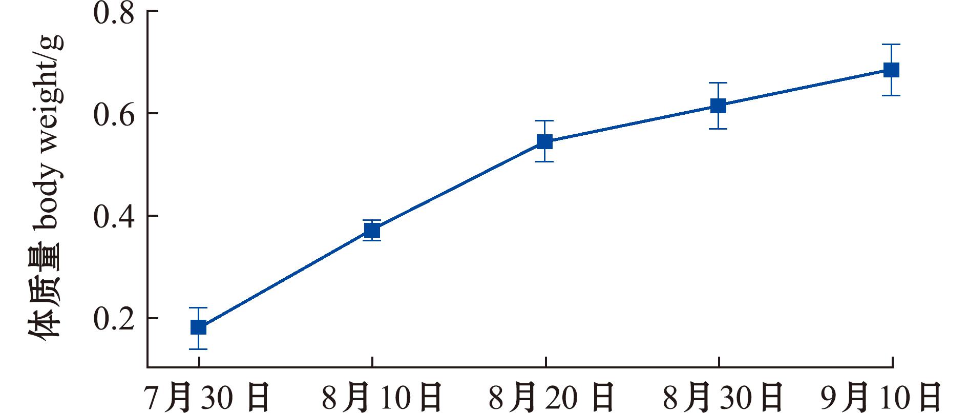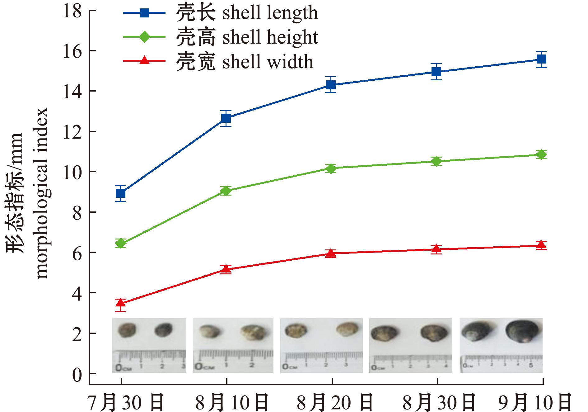 图2为2023年7月30日—9月10日池塘中间育成蛤仔的壳长、壳高及壳宽的变化情况。从图2可见,随着池塘中间育成时间的推进,蛤仔的壳长、壳高和壳宽均呈现出增长态势。2023年7月30日,蛤仔的壳长为8.92 mm,壳高为6.45 mm,壳宽为3.48 mm。7月30日—8月10日,蛤仔生长速度较为迅速,其中,壳长的平均增长速率达到0.37 mm/d,壳高的平均增长速率为0.26 mm/d,壳宽的平均增长速率为0.17 mm/d。至8月10日时,蛤仔的壳长增长至12.66 mm,壳高增长至9.06 mm,壳宽增长至5.15 mm。至9月10日,池塘中间育成蛤仔的平均壳长达到15.58 mm,平均壳高为10.87 mm,平均壳宽为6.35 mm。整个试验期间,池塘中间育成蛤仔壳长的平均增长率为0.14 mm/d,壳高的平均增长速率为0.12 mm/d,壳宽的平均增长速率为0.04 mm/d。