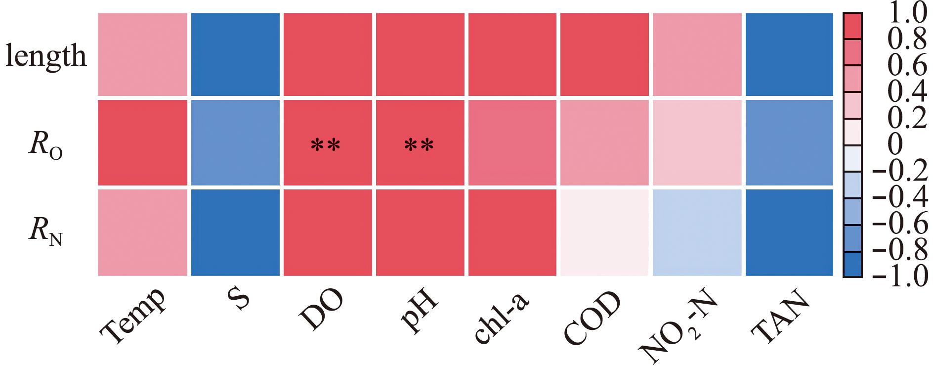 为深入探究夏季北方池塘中蛤仔中间育成阶段的生长代谢与水质之间的内在联系,本研究中针对蛤仔生长代谢与水环境因子展开了相关性分析(图8)。从图8可见,在夏季北方池塘环境下,中间育成阶段的蛤仔,其壳长与池塘水体的溶解氧、pH值、化学需氧量(COD)及叶绿素a含量均呈现出显著的正相关关系。同时,蛤仔的耗氧率与水体溶解氧和pH值之间存在极显著的正相关;蛤仔的排氨率与水体溶解氧、pH值及叶绿素a含量同样呈显著正相关。此外,夏季北方池塘中间育成的菲律宾蛤仔,其生长和代谢与池塘水的盐度及水中总氨氮浓度均呈现负相关关系。