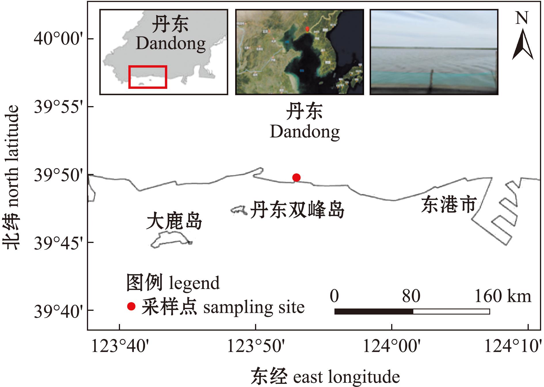 本试验在辽宁丹东东港双峰岛进行,该试验地点的经度为123°53′16″,纬度为39°49′57″(图1)。开展蛤仔中间育成池塘占地约7.3 hm2,水深为1.5~2.0 m,涨潮时可自然纳水。试验池塘所投放的蛤仔苗种来源于本地室内人工繁育的苗种,2023年7月20日测得池塘播放的蛤仔苗种个体的平均壳长为8.76 mm,平均体质量为0.13 g,放养密度约为5 000 ind./m2。