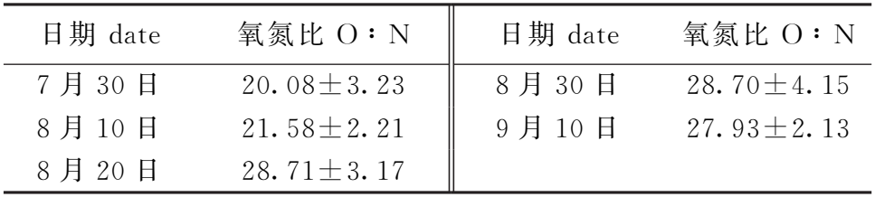 日期 date 氧氮比 O∶N 日期 date 氧氮比 O∶N 7月30日 20.08±3.23 8月30日 28.70±4.15 8月10日 21.58±2.21 9月10日 27.93±2.13 8月20日 28.71±3.17