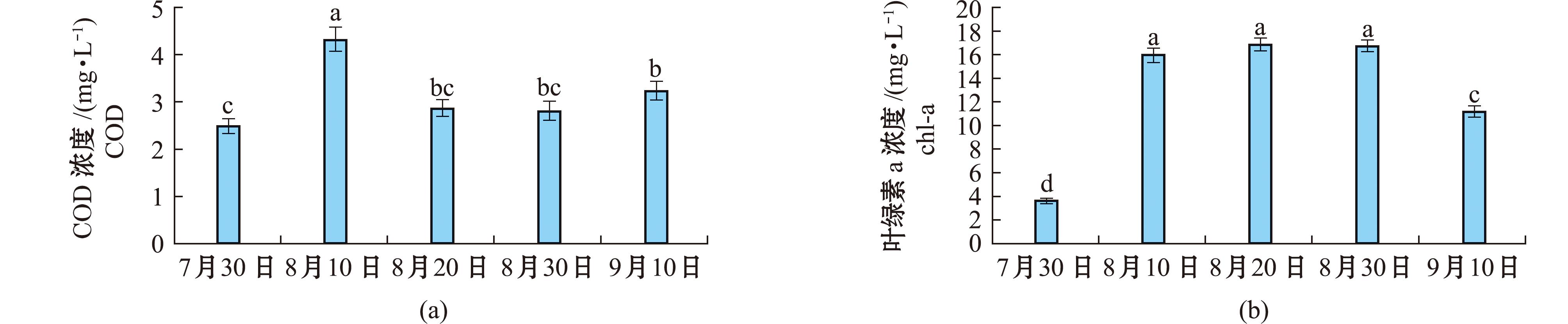 图7为蛤仔中间育成池塘水中化学需氧量(COD)和叶绿素a的变化。图7(a)为池塘水中COD浓度变化,在7月30日仅为2.49 mg/L,8月10日水中COD浓度达到4.32 mg/L,8月20日—9月10日水中COD为2.86~3.24 mg/L。水中叶绿素a浓度变化如图7(b)所示,在7月30日最低为3.66 μg/L,在8月10日为16.02 μg/L,在8月20日达到最高值为16.86 μg/L,至9月10日时叶绿素a浓度降至11.17 μg/L。