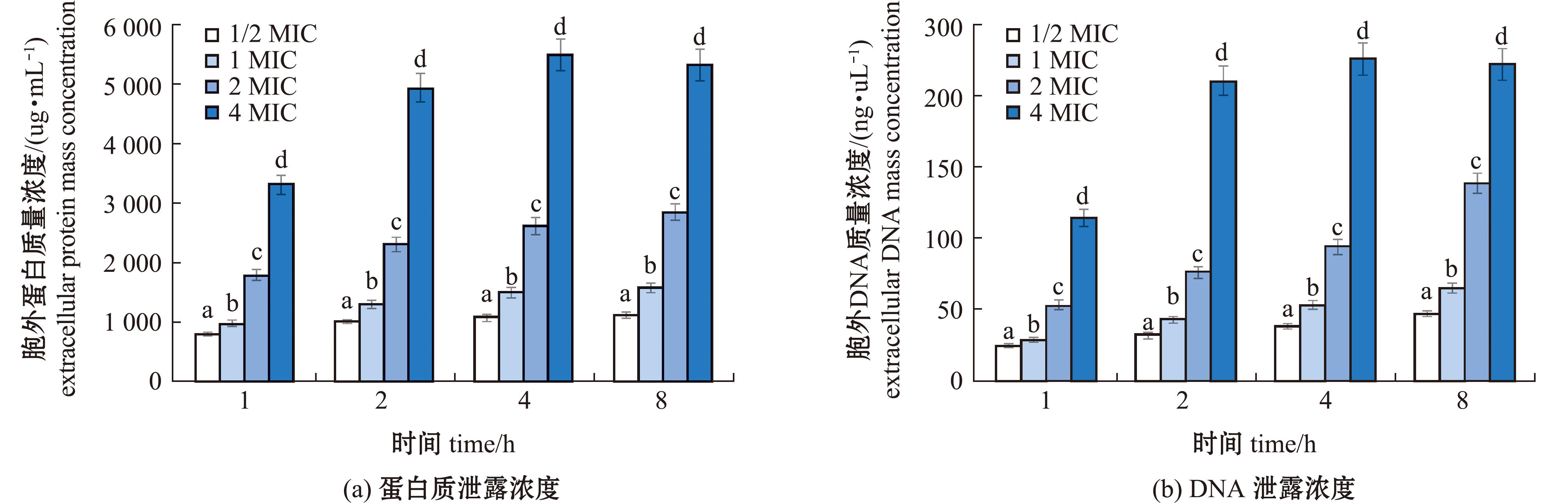 当菌体细胞膜受到破坏时,细胞内的蛋白质、核酸等大分子物质会发生泄漏。基于此,可将细胞内大分子物质的外泄浓度作为衡量细胞膜受损程度的重要依据[27]。本试验运用超微量核酸蛋白检测仪,测定了不同浓度百里香酚作用于嗜水气单胞菌后上清液中的蛋白质和核酸质量浓度,并以此判断细胞内大分子物质的外泄情况。试验结果如图7所示,在百里香酚作用下,上清液中蛋白质(图7(a))与DNA(图7(b))的浓度均呈现显著上升趋势(P<0.05)。同时,这些大分子物质的外泄浓度与百里香酚的作用时间及浓度均呈现明显的正相关关系。这表明,随着百里香酚作用时间的延长和浓度的增加,嗜水气单胞菌细胞膜的受损程度加剧,并导致更多细胞内大分子物质外泄。