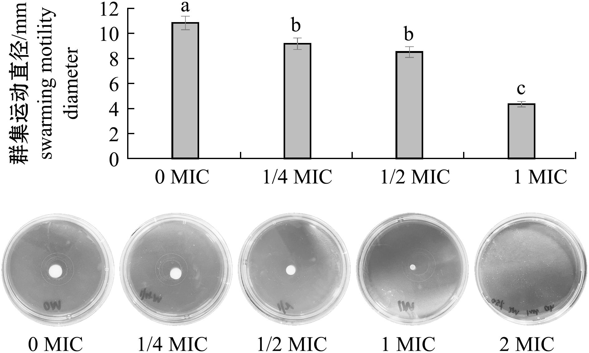 群集运动是细菌借助鞭毛和Ⅳ型菌毛(type Ⅳ pili,TFP),以群体形式在半固体表面进行的协调性共同运动,属于典型的协同运动模式[20]。这种运动方式有助于病原菌在宿主表面定植,进而对宿主造成损害[21]。已有研究证实,嗜水气单胞菌具有极地鞭毛和Ⅳ型菌毛,因而能够发生群集运动[22]。图3展示了不同浓度百里香酚对嗜水气单胞菌群集运动能力的影响状况。结果显示,与对照组相比,添加不同浓度的百里香酚均能对嗜水气单胞菌的群集能力产生抑制作用。具体而言,当百里香酚浓度分别为1/4、1/2、1 MIC时,细菌群集运动直径分别为对照组运动直径的85%、78%、40%。而当百里香酚浓度达到2 MIC时,培养基上已无细菌生长。这一结果与之前所观察到的百里香酚对嗜水气单胞菌生长曲线的影响结果高度一致。
