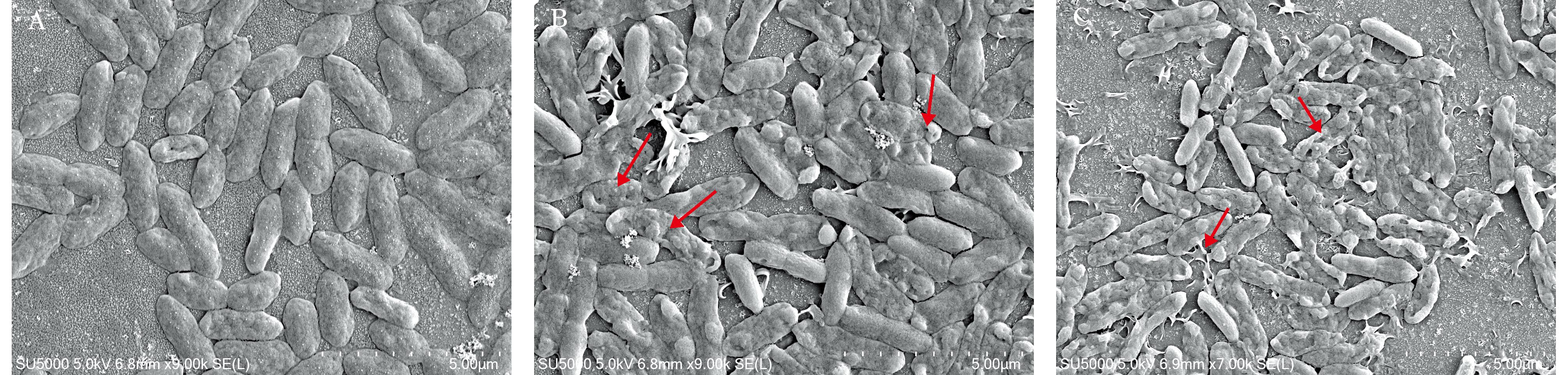 为探究百里香酚对嗜水气单胞菌形态的影响,采用热场发射扫描电镜,对经百里香酚处理的嗜水气单胞菌进行观察,结果如图6所示,未经百里香酚处理的嗜水气单胞菌,菌体形态保持正常,细胞完整,既无破损迹象,也未出现明显塌陷(图6A)。而当采用1/2 MIC浓度的百里香酚处理后,嗜水气单胞菌的细胞表面出现了明显的塌陷情况,部分菌体表面甚至出现破裂(图6B)。进一步将百里香酚浓度提高至1 MIC时,嗜水气单胞菌的细胞壁遭到严重破坏,菌体形态结构改变,部分菌体严重破裂,产生大量细胞碎片(图6C)。通过扫描电镜的观察结果可知,百里香酚能破坏嗜水气单胞菌的菌体形态,进而实现杀菌效果。