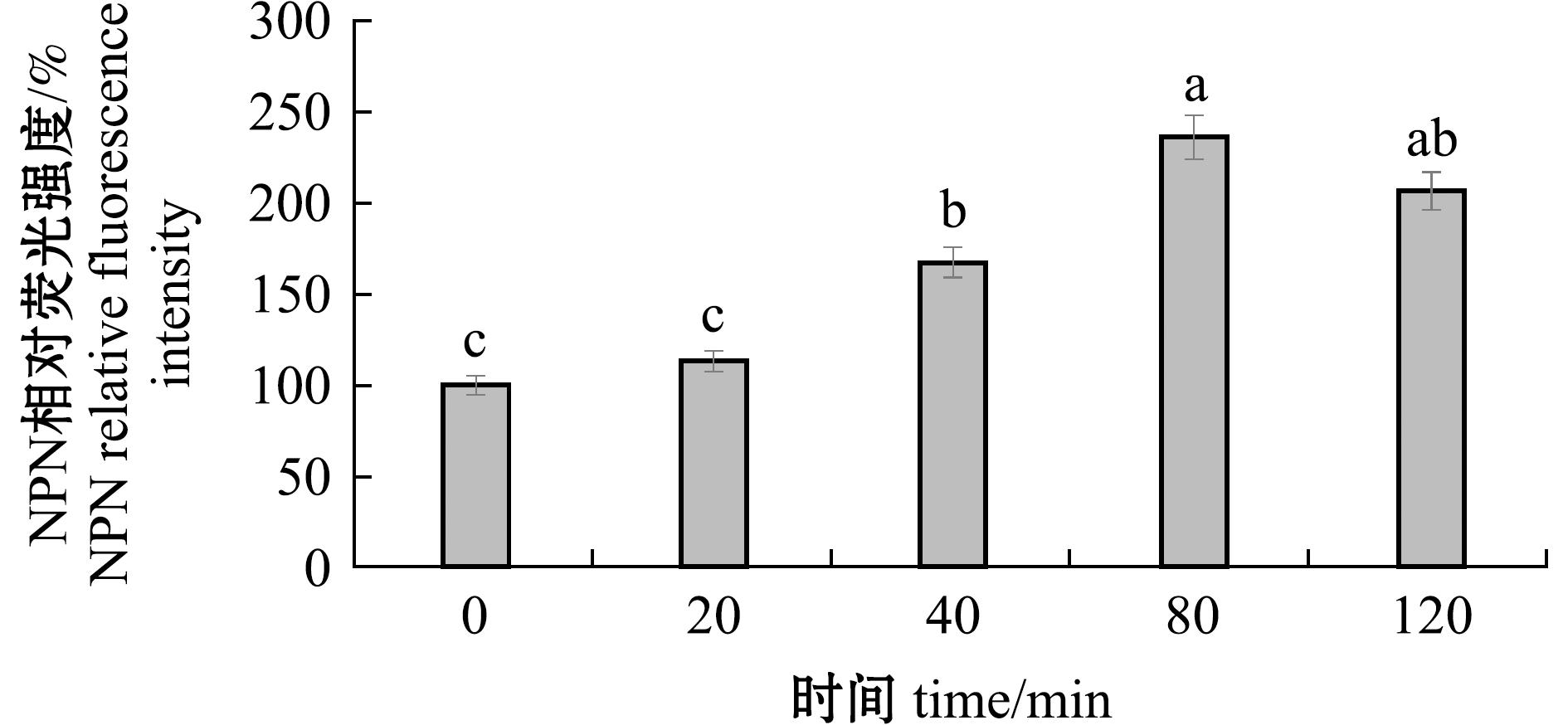革兰氏阴性菌的细胞包膜结构复杂,由质膜、肽聚糖细胞壁和外膜构成,其中,外膜对维持细胞强度起着关键作用[23]。正苯基萘胺(1-N-phenyl-naphtylamine;NPN)作为疏水性荧光探针,正常情况下会被完整的细菌细胞外膜排斥。但当外膜受损,NPN便能进入膜磷脂层,进而引发荧光增强现象,基于此特性,可利用 NPN来评估细菌外膜的损伤程度[24]。