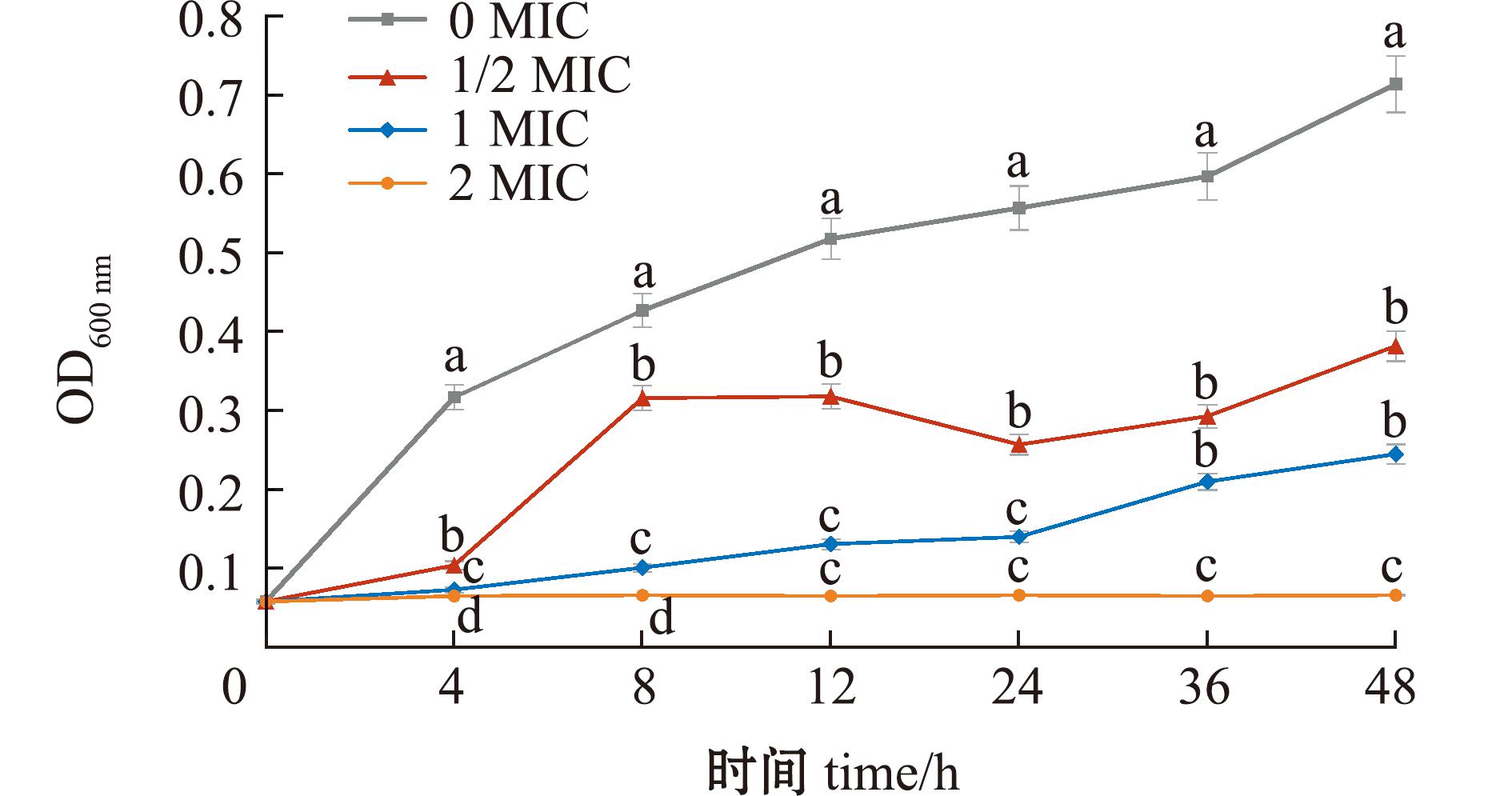 1.2.3 时间-杀菌曲线 时间-杀菌曲线的绘制方法参照文献[13],并在此基础上进行了适当调整。具体操作如下:在多个50 mL离心管中,分别加入等体积但浓度不同的百里香酚溶液,其浓度梯度设置为0(对照组)、1/2、1、2 MIC。接着,向各离心管内加入等体积的菌悬液,使管内细菌的最终浓度为1.0×106 CFU/mL。将离心管放置于30 ℃、180 r/min摇床震荡培养。在培养过程中,于0、4、8、12、24、36、48 h,按顺序取出离心管,混匀后取等量样品,使用酶标仪(Synergy H1,美国伯腾仪器有限公司)测定样品的OD600 nm值。为保证数据的准确可靠,每项操作重复3次,取其均值。最后,根据所得数据绘制时间-杀菌曲线。