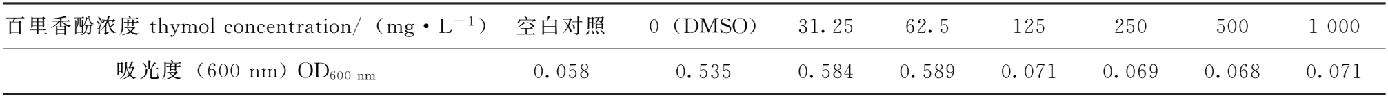 百里香酚浓度thymolconcentration/ (mg·L-1) 空白对照 0 (DMSO) 31.25 62.5 125 250 500 1000 吸光度 (600nm)OD600nm 0.058 0.535 0.584 0.589 0.071 0.069 0.068 0.071