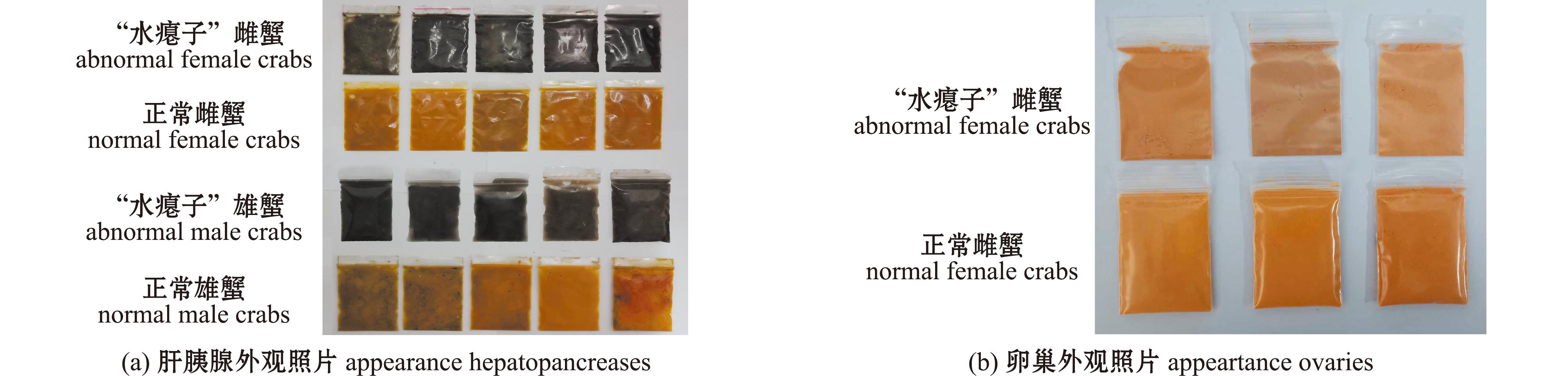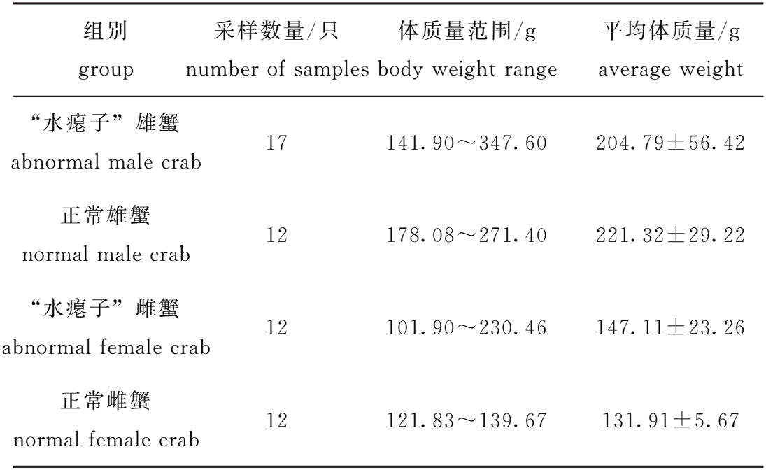 组别 group 采样数量/只 numberofsamples 体质量范围/g bodyweightrange 平均体质量/g averageweight “水瘪子”雄蟹 abnormalmalecrab 17 141.90~347.60 204.79±56.42 正常雄蟹 normalmalecrab 12 178.08~271.40 221.32±29.22 “水瘪子”雌蟹 abnormalfemalecrab 12 101.90~230.46 147.11±23.26 正常雌蟹 normalfemalecrab 12 121.83~139.67 131.91±5.67