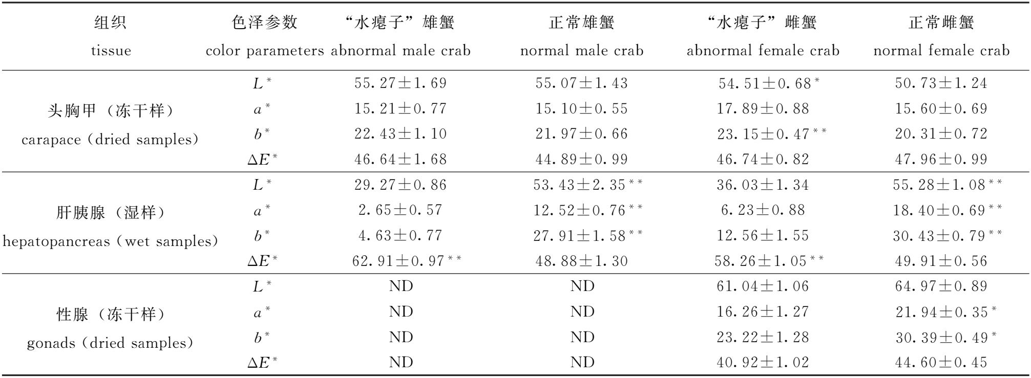 组织 tissue 色泽参数 colorparameters “水瘪子”雄蟹 abnormalmalecrab 正常雄蟹 normalmalecrab “水瘪子”雌蟹 abnormalfemalecrab 正常雌蟹 normalfemalecrab 头胸甲 (冻干样) carapace(driedsamples) L* 55.27±1.69 55.07±1.43 54.51±0.68* 50.73±1.24 a* 15.21±0.77 15.10±0.55 17.89±0.88 15.60±0.69 b* 22.43±1.10 21.97±0.66 23.15±0.47** 20.31±0.72 ΔE* 46.64±1.68 44.89±0.99 46.74±0.82 47.96±0.99 肝胰腺 (湿样) hepatopancreas(wetsamples) L* 29.27±0.86 53.43±2.35** 36.03±1.34 55.28±1.08** a* 2.65±0.57 12.52±0.76** 6.23±0.88 18.40±0.69** b* 4.63±0.77 27.91±1.58** 12.56±1.55 30.43±0.79** ΔE* 62.91±0.97** 48.88±1.30 58.26±1.05** 49.91±0.56 性腺 (冻干样) gonads(driedsamples) L* ND ND 61.04±1.06 64.97±0.89 a* ND ND 16.26±1.27 21.94±0.35* b* ND ND 23.22±1.28 30.39±0.49* ΔE* ND ND 40.92±1.02 44.60±0.45