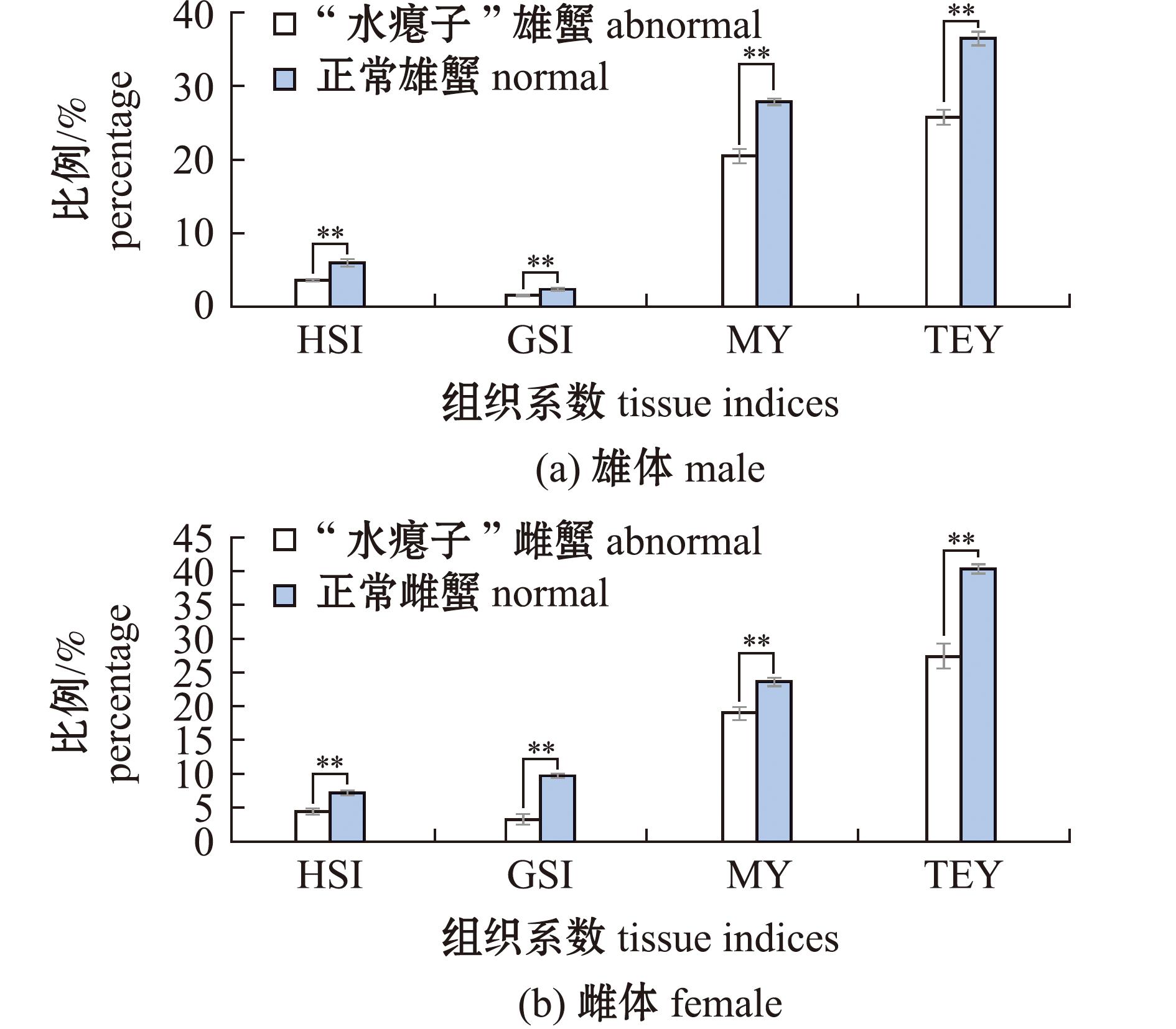 “水瘪子”蟹和正常蟹的肝胰腺指数(hepatosomatic index,HSI)、性腺指数(gonadosomatic index,GSI)、出肉率(meat yield,MY)和总可食率(total edible yield,TMY)数据如图2所示。无论雌蟹与雄蟹,“水瘪子”蟹组的HSI、GSI、MY和TMY均极显著低于正常蟹组 (P<0.01)。就雄体而言,正常组HSI超过5%,而“水瘪子”蟹组HSI和GSI均低于5%,正常蟹组MY超过25%,TMY接近35%。
