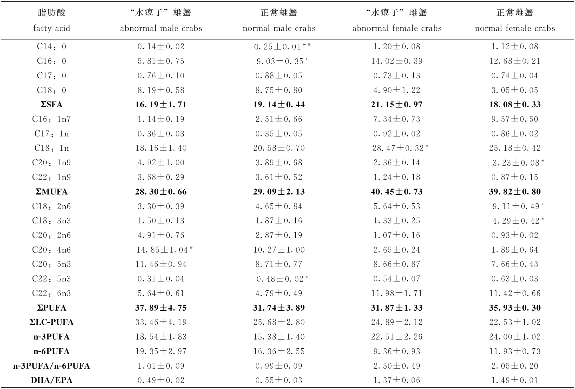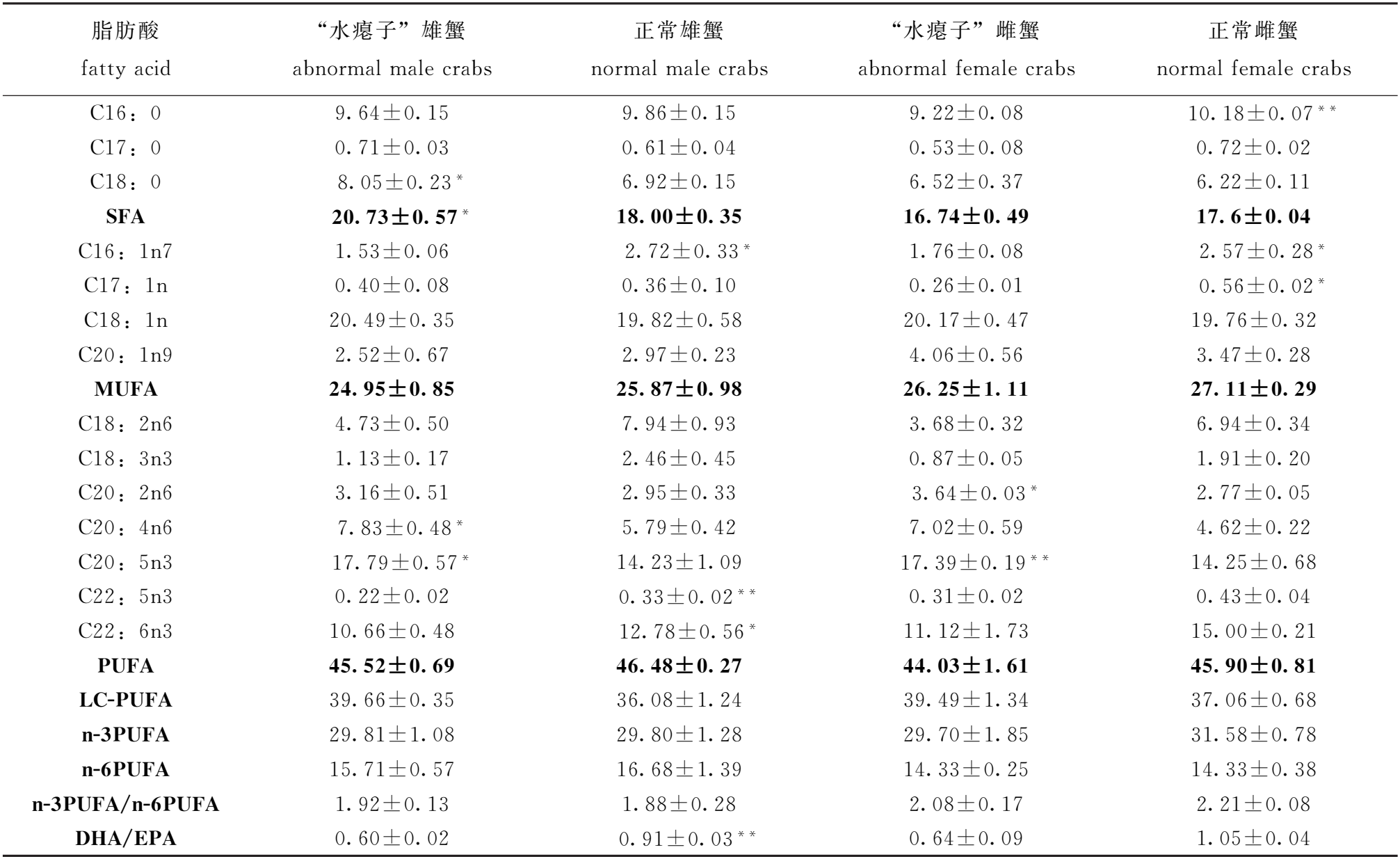 脂肪酸 fattyacid “水瘪子”雄蟹 abnormalmalecrabs 正常雄蟹 normalmalecrabs “水瘪子”雌蟹 abnormalfemalecrabs 正常雌蟹 normalfemalecrabs C14:0 0.89±0.25 1.06±0.11 1.81±0.29 2.13±0.21 C15:0 0.54±0.05 0.53±0.03 0.63±0.03 0.77±0.02* C16:0 16.98±1.24 18.92±1.06 18.00±0.78 18.18±0.65 C17:0 2.39±0.23** 1.15±0.17 1.80±0.23 1.40±0.19 C18:0 5.20±0.40* 2.58±0.04 3.69±0.51 2.27±0.04 SFA 26.00±1.43 24.23±0.94 25.93±1.15 24.75±0.84 C16:1n7 3.56±0.51 9.21±1.72* 4.06±0.22 9.17±0.67** C17:1n 0.42±0.12 0.53±0.06 0.39±0.09 0.76±0.06* C18:1n 23.38±0.86 24.93±0.93 24.25±0.64 26.39±1.25 C20:1n9 4.28±0.56 2.89±0.80 9.26±0.47** 3.98±0.42 C22:1n9 3.10±0.79 2.98±1.67 5.23±0.39** 2.00±0.26 MUFA 34.80±2.21 39.11±1.85 43.20±1.16 42.70±2.04 C18:2n6 4.68±1.86 9.60±1.76 3.30±0.53 9.13±1.43* C18:3n3 2.31±1.09 3.24±0.48 0.66±0.01 3.39±0.51* C20:2n6 3.10±0.46* 1.62±0.18 2.84±0.25** 1.01±0.06 C20:4n6 5.11±1.37 1.95±0.60 2.94±0.07** 1.06±0.08 C20:5n3 4.90±0.95* 1.79±0.47 3.47±0.19** 2.33±0.25 C22:5n3 1.17±0.30 0.64±0.20 4.12±0.34** 0.63±0.08 C22:6n3 4.57±0.66 3.77±1.15 5.18±0.53 6.34±0.83 PUFA 24.69±3.72 21.18±2.11 22.07±1.16 23.90±2.42 LC-PUFA 18.86±2.85 9.16±2.49 18.55±0.52** 11.37±1.12 n-3PUFA 11.81±1.44 8.51±1.37 12.99±0.82 12.69±1.48 n-6PUFA 12.89±2.32 12.67±1.50 9.08±0.34 11.21±1.57 n-3PUFA/n-6PUFA 0.98±0.10 0.71±0.16 1.43±0.04 1.19±0.18 DHA/EPA 1.00±0.16 2.01±0.18* 1.53±0.22 2.71±0.10**