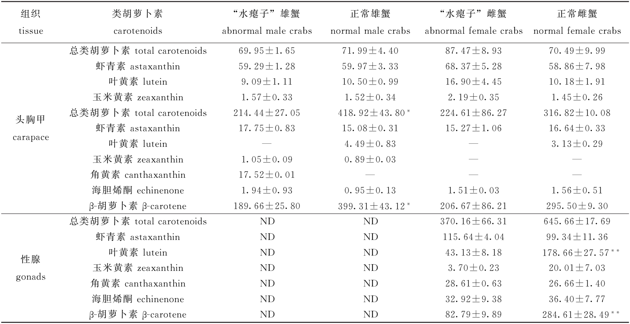 组织 tissue 类胡萝卜素 carotenoids “水瘪子”雄蟹 abnormalmalecrabs 正常雄蟹 normalmalecrabs “水瘪子”雌蟹 abnormalfemalecrabs 正常雌蟹 normalfemalecrabs 总类胡萝卜素totalcarotenoids 69.95±1.65 71.99±4.40 87.47±8.93 70.49±9.99 虾青素 astaxanthin 59.29±1.28 59.97±3.33 68.37±5.28 58.86±7.98 叶黄素lutein 9.09±1.11 10.50±0.99 16.90±4.45 10.18±1.91 玉米黄素zeaxanthin 1.57±0.33 1.52±0.34 2.19±0.35 1.45±0.26 总类胡萝卜素totalcarotenoids 214.44±27.05 418.92±43.80* 224.61±86.27 316.82±10.08 头胸甲 carapace 虾青素 astaxanthin 17.75±0.83 15.08±0.31 15.27±1.06 16.64±0.33 叶黄素lutein — 4.49±0.83 — 3.13±0.29 玉米黄素zeaxanthin 1.05±0.09 0.89±0.03 — — 角黄素 canthaxanthin 17.52±0.01 — — — 海胆烯酮 echinenone 1.94±0.93 0.95±0.13 1.51±0.03 1.56±0.51 β-胡萝卜素 β-carotene 189.66±25.80 399.31±43.12* 206.67±86.21 295.50±9.30 总类胡萝卜素totalcarotenoids ND ND 370.16±66.31 645.66±17.69 虾青素 astaxanthin ND ND 115.64±4.04 99.34±11.36 叶黄素lutein ND ND 43.13±8.18 178.66±27.57** 性腺 gonads 玉米黄素zeaxanthin ND ND 3.70±0.23 20.01±7.03 角黄素 canthaxanthin ND ND 28.61±0.63 26.66±1.40 海胆烯酮 echinenone ND ND 32.92±9.38 36.40±7.77 β-胡萝卜素 β-carotene ND ND 82.79±9.89 284.61±28.49**